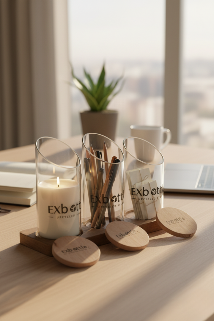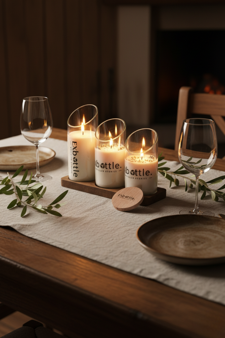 Exbottle Slanted-Cut Upcycled Trio Set — Handcrafted Candle, Vase, Tumbler & Decorative Storage Set