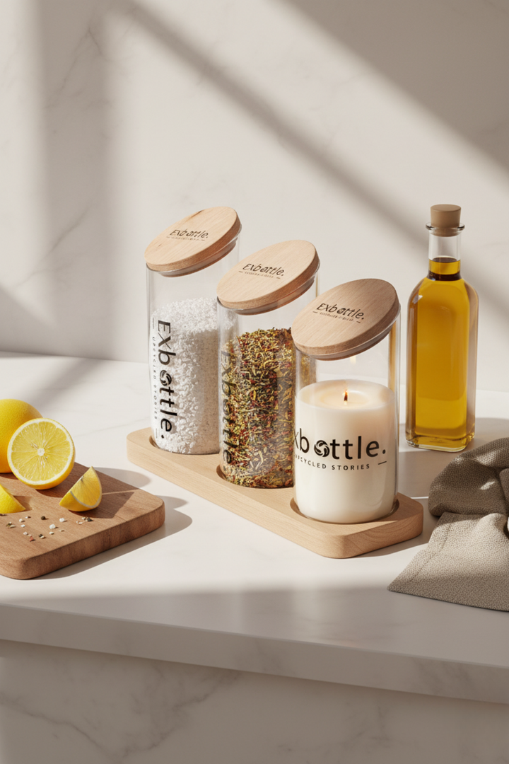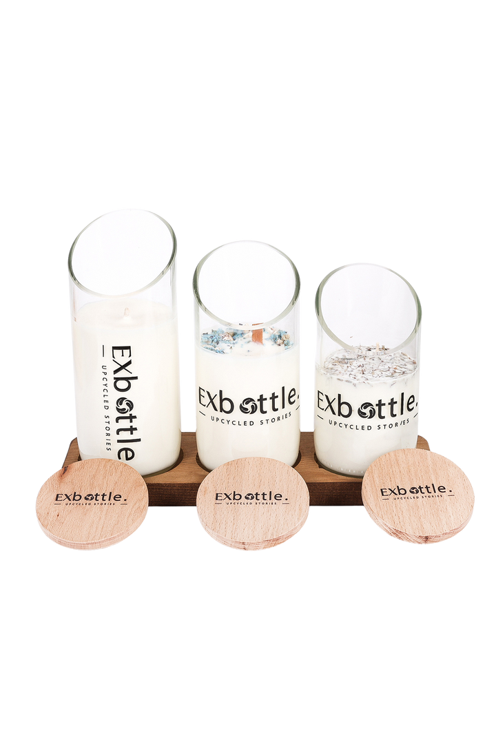 The Exbottle Slanted-Cut Trio Set starts as three artisanal candles and continues its life as multifunctional glass pieces for your home. Each vessel, handcrafted from upcycled glass bottles, features Exbottle’s signature slanted-cut rim and natural wooden lid, displayed beautifully on a solid pine tray.